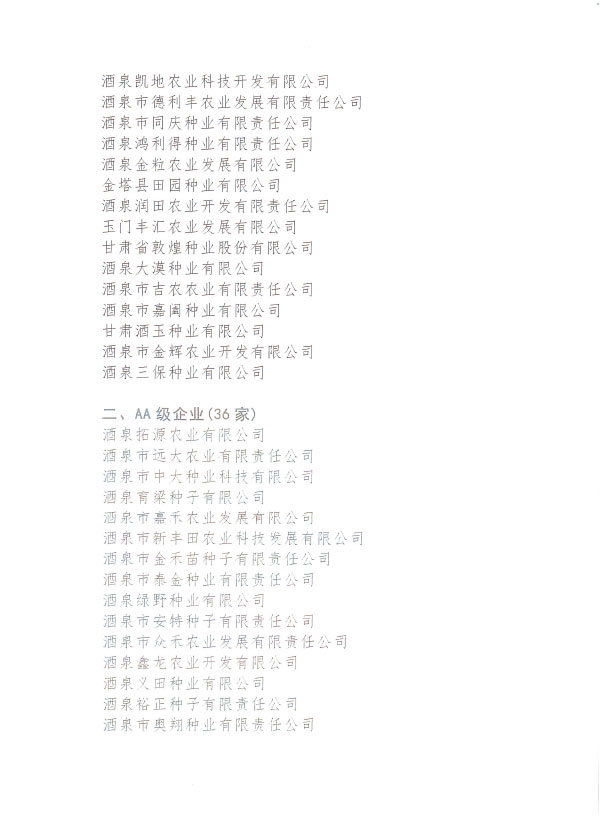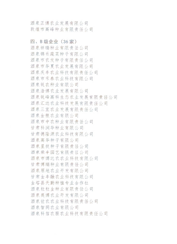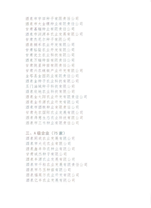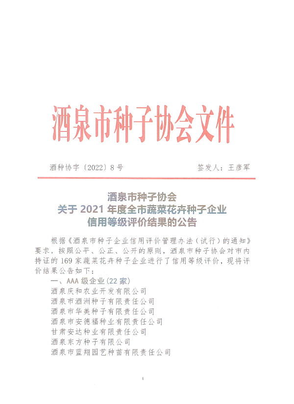 酒泉市種子協(xié)會關(guān)于2021年度全市蔬菜花卉種子企業(yè)信用等級評價結(jié)果的公告