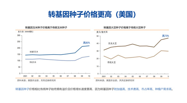轉基因種子價格相比傳統(tǒng)種子始終擁有溢價目價格增長速度要高,因為轉基因種子附加值高、技術費高,市占率高,種植戶需求高。