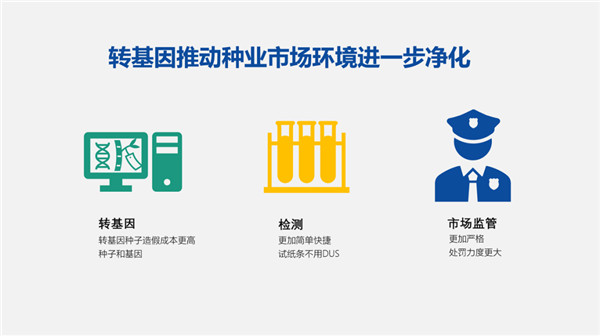 轉基因推動種業(yè)市場環(huán)境進一步凈化,轉基因種子透假成本更高(種子和基因);檢測更加簡單快捷,用試紙條即可,不用進行 DUS ;市場監(jiān)管更加嚴格,處罰力度更大。