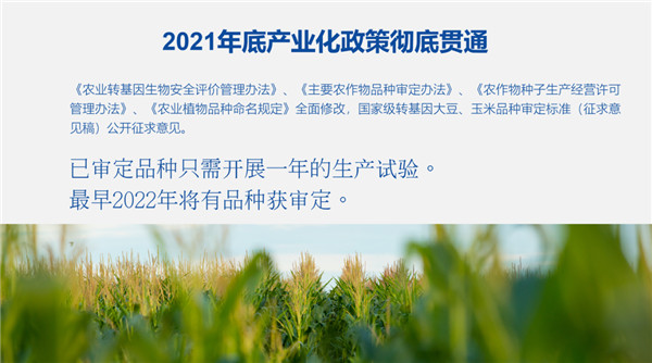 2021 年底產業(yè)化政策徹底貫通!掇r業(yè)轉基因生物安全評價管理辦法》,《主要農作物品種審定辦法》、《農作物種子生產經營許可管理辦法》、《農業(yè)植物品種命名規(guī)定》全面修改,國家級轉基因大豆、玉米品種審定標準(征求意見稿)公開征求意見。已審定品種只需開展一年的生產試驗,最早 2022 年將有品種獲審定。
