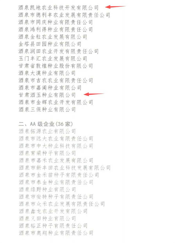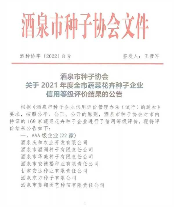 為推動全市蔬菜花卉種子產(chǎn)業(yè)健康快速穩(wěn)定發(fā)展,規(guī)范行業(yè)秩序,強(qiáng)化行業(yè)自律,營造誠實(shí)守信、公平競爭的市場環(huán)境。酒泉市種子協(xié)會根據(jù)《酒泉市種子企業(yè)信用評價管理辦法(試行)的通知》要求,按照公平、公正、公開、有利于企業(yè)發(fā)展的原則,從企業(yè)綜合素質(zhì)、管理水平、競爭力、信用記錄、財務(wù)能力等五個方面23項指標(biāo),對全市蔬菜花卉種子企業(yè)進(jìn)行了信用等級評價,現(xiàn)將評價結(jié)果予以公示。