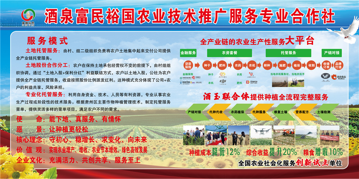 甘肅酒玉種業(yè)有限公司是2016年注冊成立的一家股份合作制民營企業(yè),主要從事玉米、小麥、向日葵、籽用型西葫蘆種子的研發(fā)、生產(chǎn)、加工、銷售、農(nóng)資服務(wù)、綠色防控、病蟲害統(tǒng)防統(tǒng)治服務(wù)、農(nóng)副產(chǎn)品訂單種植回收、土地托管等業(yè)務(wù)。